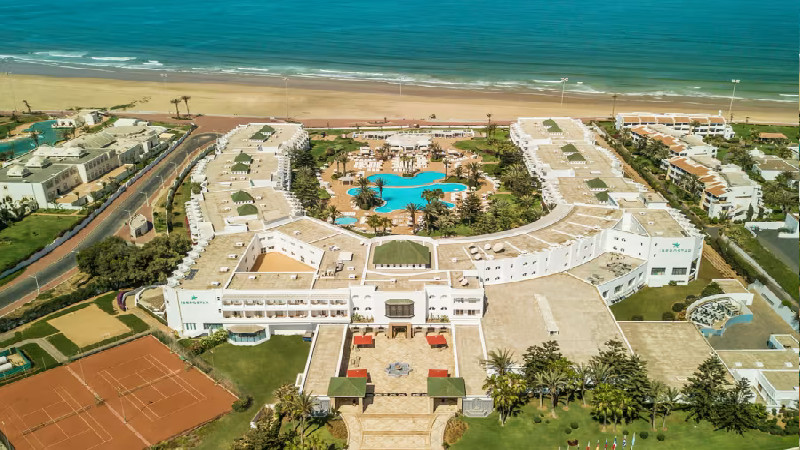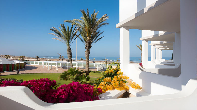 Hotellet ligger direkt vid havet och har en egen del med solstolar. En fin och bred strandpromenad leder in till Agadirs marina åt ena hållet och går man åt andra hållet kommer man till vilda sanddynor.