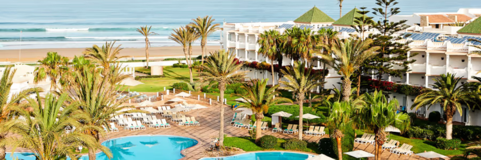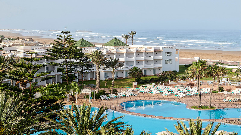 Hotellet ligger direkt vid havet och har en egen del med solstolar. En fin och bred strandpromenad leder in till Agadirs marina åt ena hållet och går man åt andra hållet kommer man till vilda sanddynor.